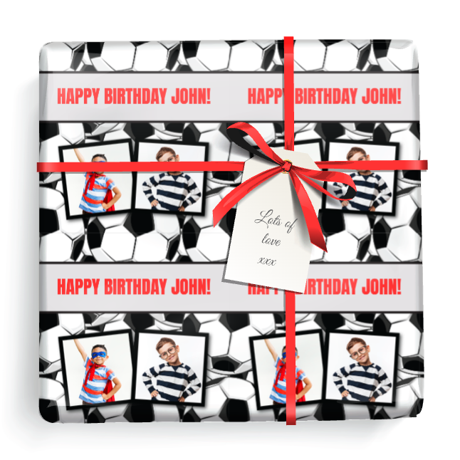 Personalised Birthday Wrapping Paper - Black & White Football - Add Text & 2 Photos